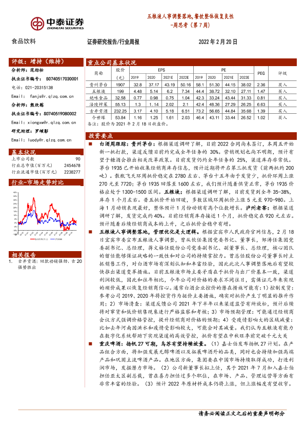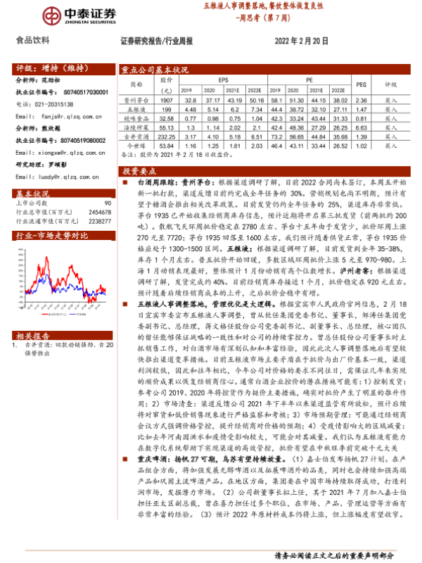 【中泰证券】【20220220】20220220-中泰证券-食品饮料周思考(第7周):五粮液人事调整落地,餐饮整体恢复良性-8页