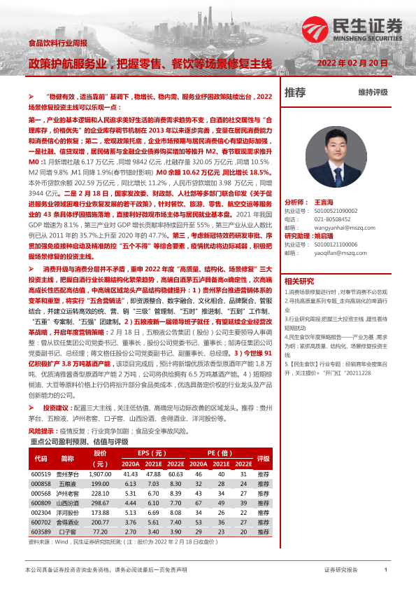 【民生证券】【20220220】食品饮料行业周报:政策护航服务业,把握零售、餐饮等场景修复主线-17页