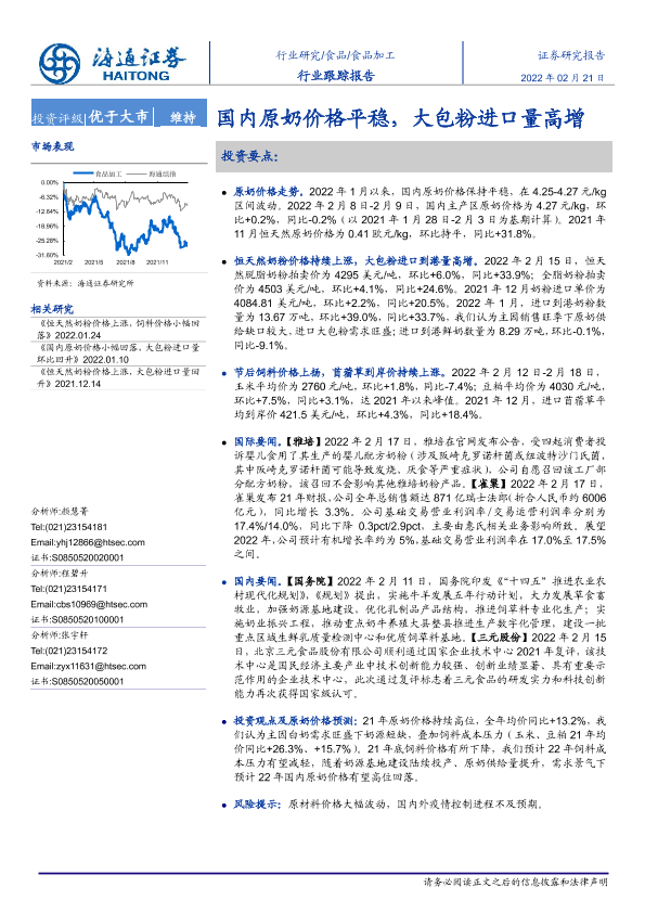 【海通证券】【20220221】食品加工行业跟踪报告:国内原奶价格平稳,大包粉进口量高增-10页