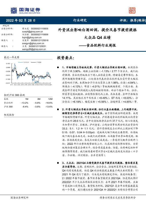 【国海证券】【20220228】20220228-国海证券-食品饮料行业周报:外资流出影响白酒回调,提价及春节提前提振大众品Q4业绩-19页