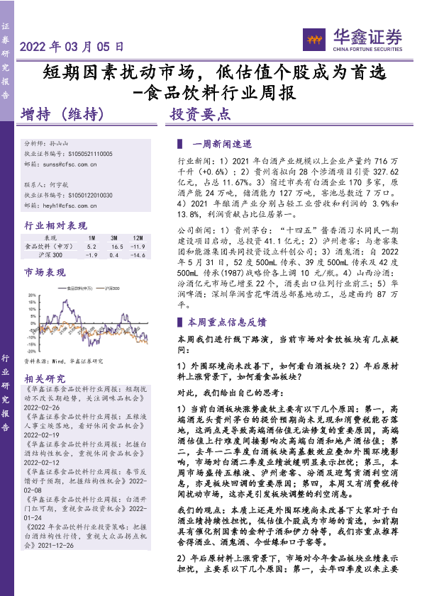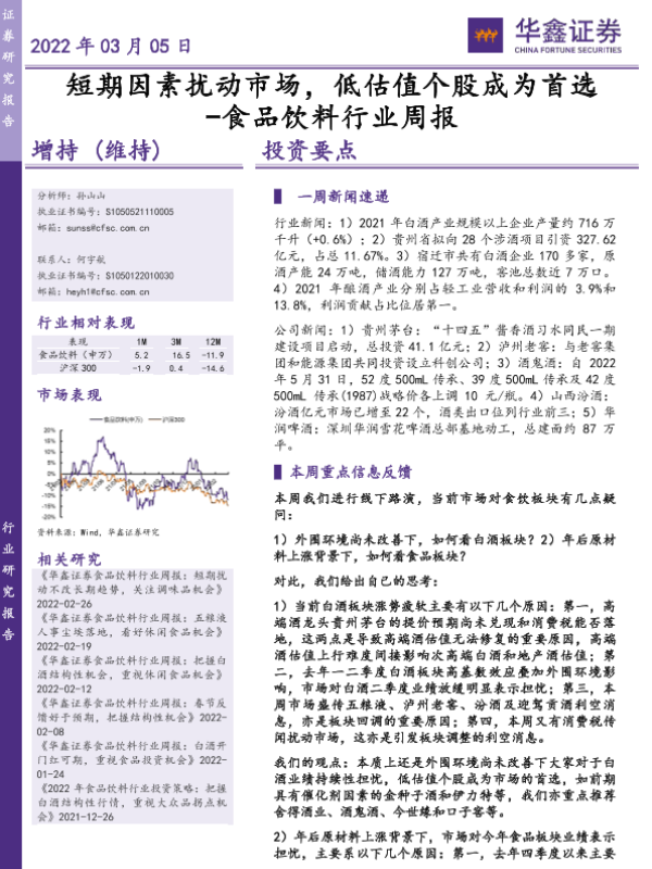 【华鑫证券】【20220305】20220305-华鑫证券-食品饮料行业周报:短期因素扰动市场,低估值个股成为首选-14页