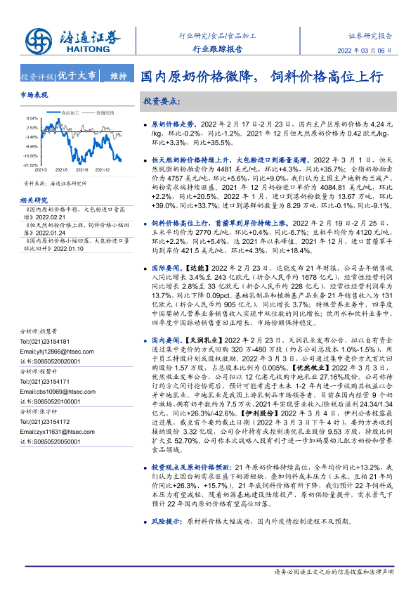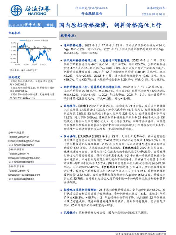 【海通证券】【20220306】20220306-海通证券-食品加工行业跟踪报告:国内原奶价格微降,饲料价格高位上行-10页