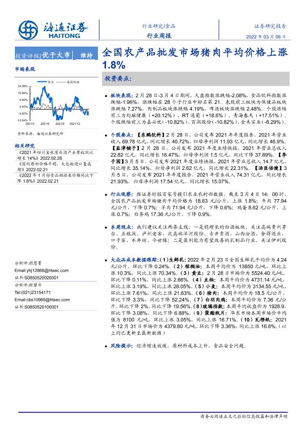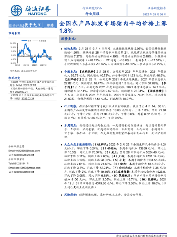【海通证券】【20220306】20220306-海通证券-食品行业周报:全国农产品批发市场猪肉平均价格上涨1.8%-9页