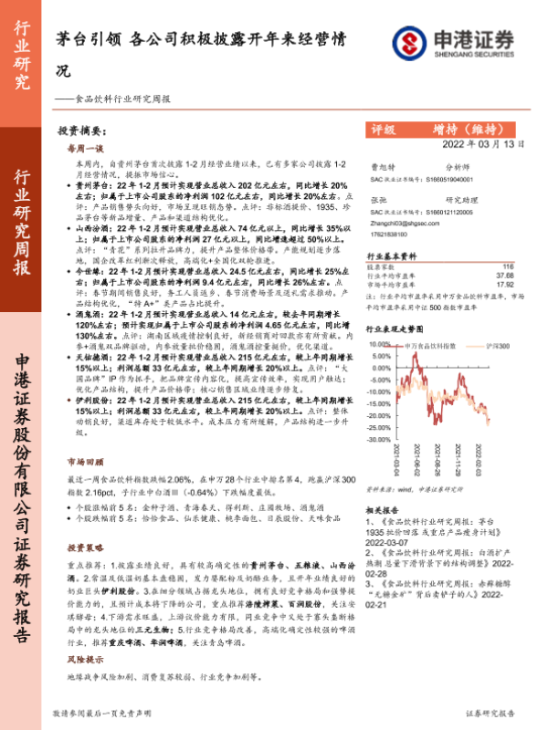【申港证券】【20220313】20220313-申港证券-食品饮料行业研究周报:茅台引领 各公司积极披露开年来经营情况-13页