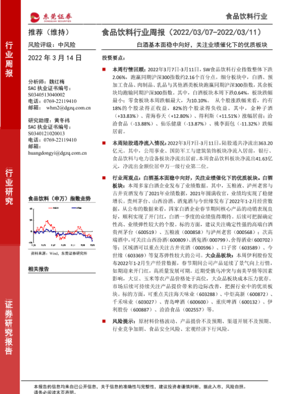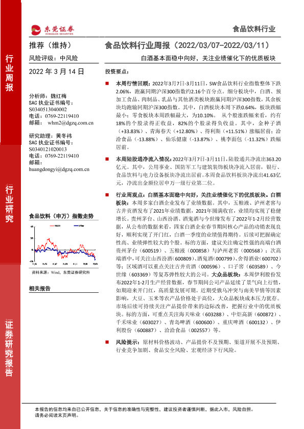 【东莞证券】【20220314】20220314-东莞证券-食品饮料行业周报:白酒基本面稳中向好,关注业绩催化下的优质板块-14页