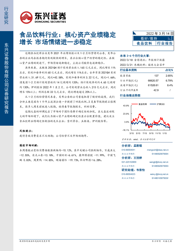 【东兴证券】【20220314】食品饮料行业:核心资产业绩稳定增长 市场情绪进一步稳定-7页