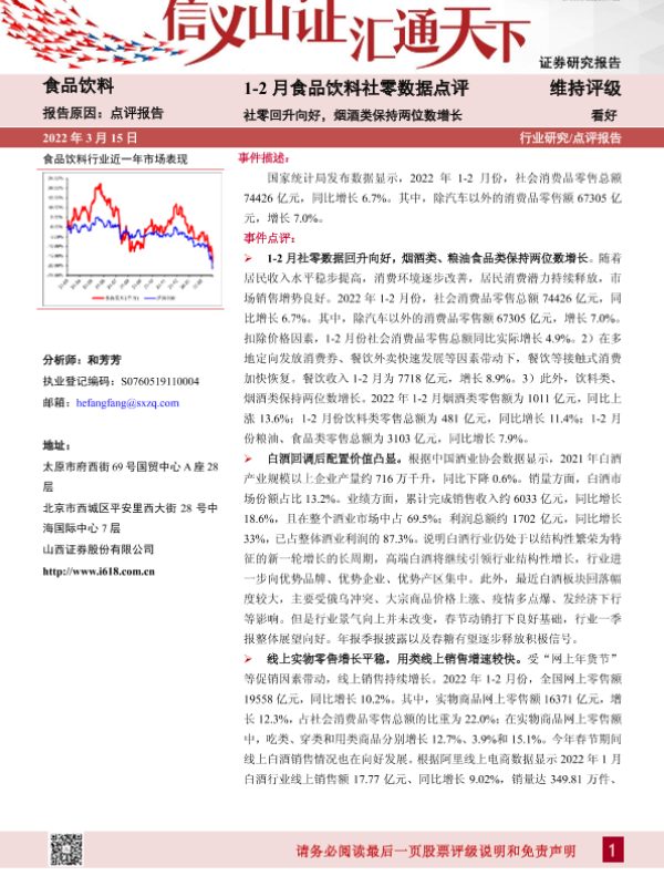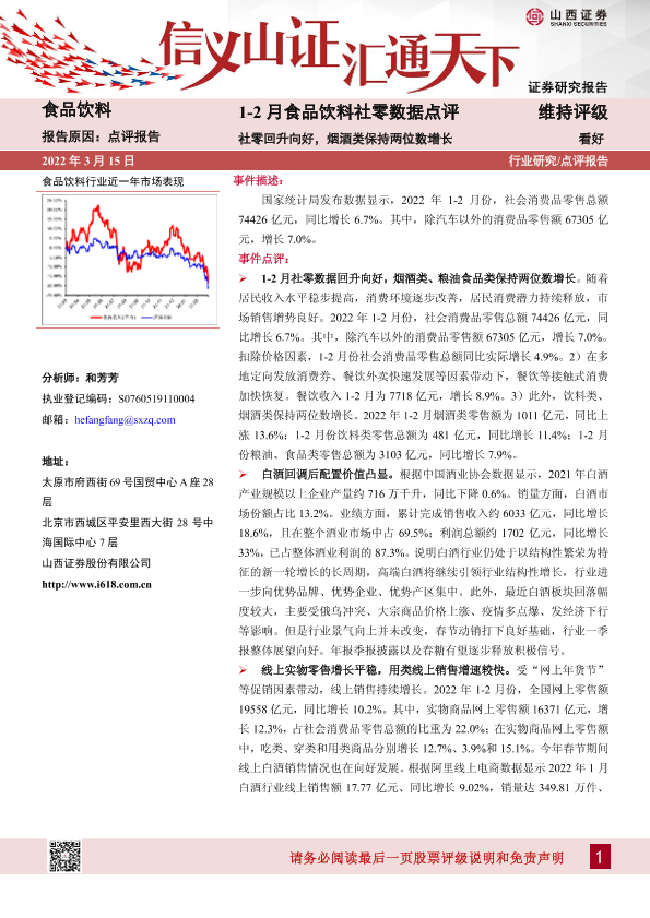 【山西证券】【20220315】20220315-山西证券-1-2月食品饮料社零数据点评:社零回升向好,烟酒类保持两位数增长-7页