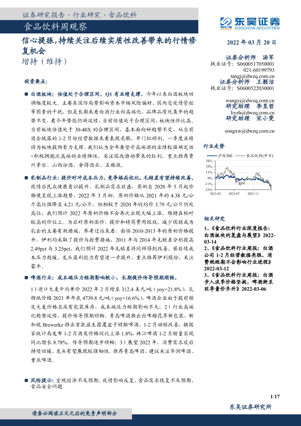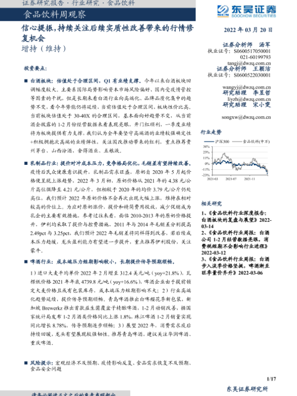 【东吴证券】【20220320】食品饮料周观察:信心提振,持续关注后续实质性改善带来的行情修复机会-17页