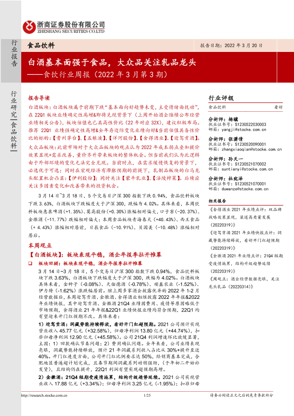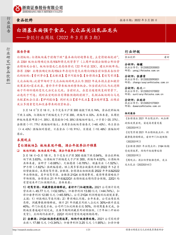 【浙商证券】【20220320】食饮行业周报(2022年3月第3期):白酒基本面强于食品,大众品关注乳品龙头-25页