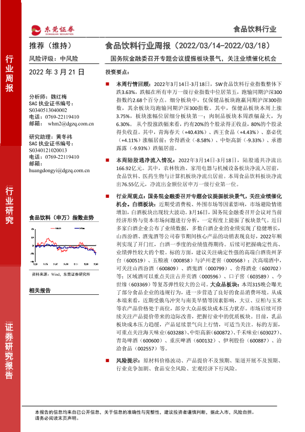 【东莞证券】【20220321】20220321-东莞证券-食品饮料行业周报:国务院金融委召开专题会议提振板块景气,关注业绩催化机会-15页