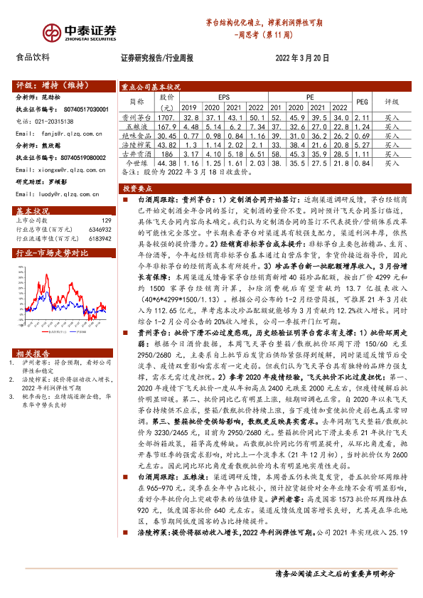 【中泰证券】【20220320】20220320-中泰证券-食品饮料周思考(第11周):茅台结构优化确立,榨菜利润弹性可期-11页