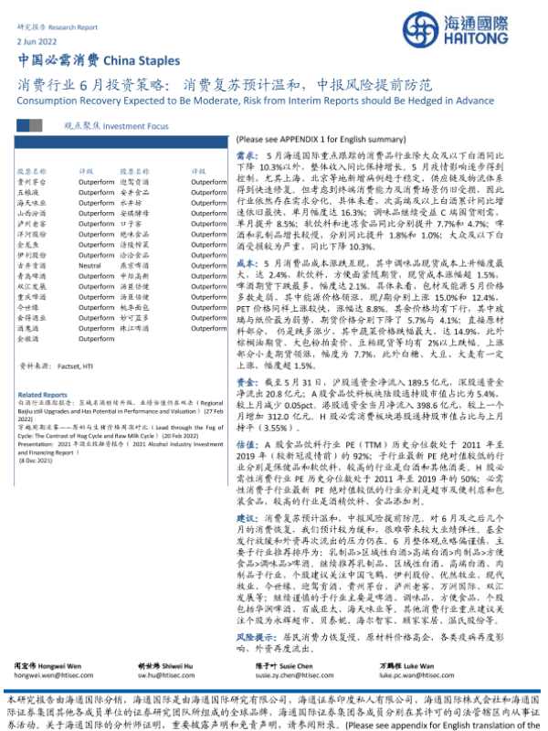 【海通国际】【20220602】消费行业6月投资策略:消费复苏预计温和,中报风险提前防范-37页