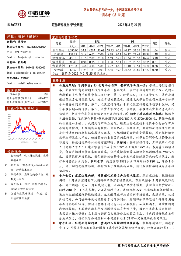 【中泰证券】【20220327】20220327-中泰证券-食品饮料周思考(第12周):茅台营销改革再迈一步,华润高端化趋势不改-13页
