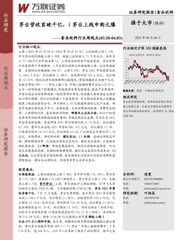 【万联证券】【20220406】20220406-万联证券-食品饮料行业周观点:茅台营收首破千亿,i茅台上线申购火爆-12页
