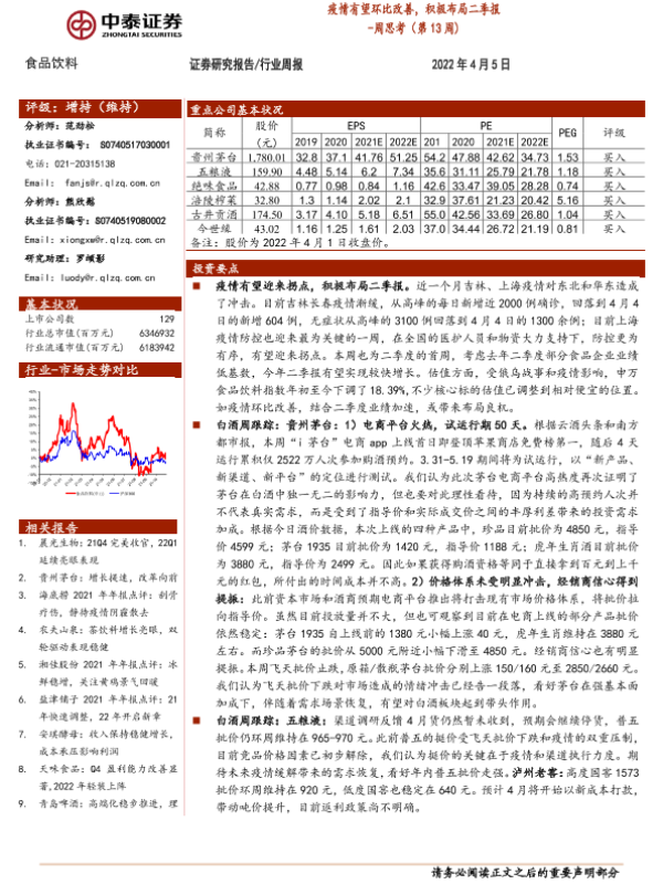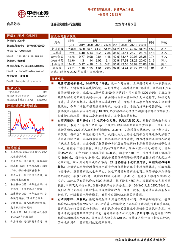 业绩前瞻 投资策略 疫情分析 股市分析 食品饮料
