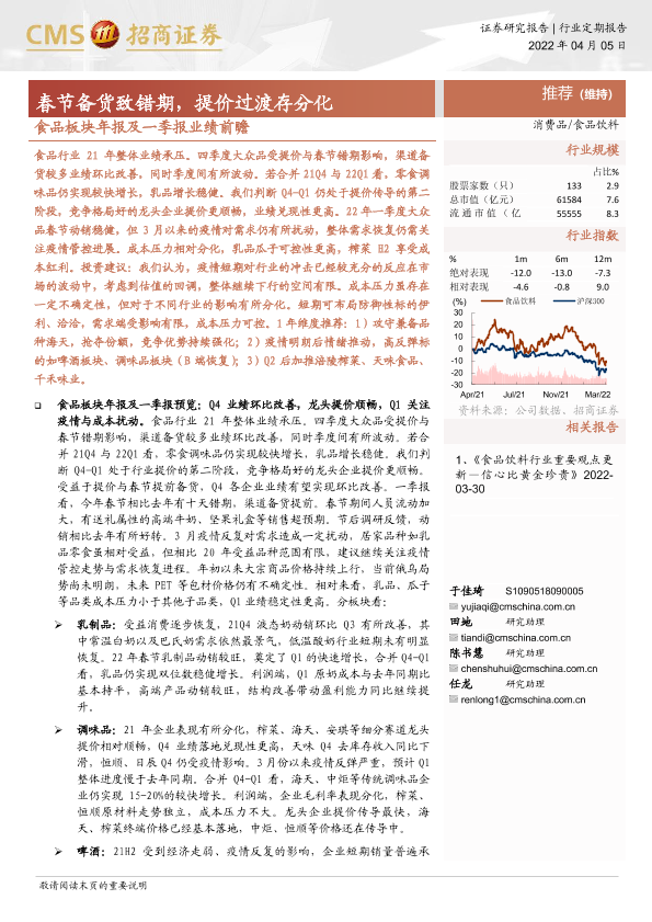 【海通证券】【20220405】食品板块年报及一季报业绩前瞻:春节备货致错期,提价过渡存分化-12页