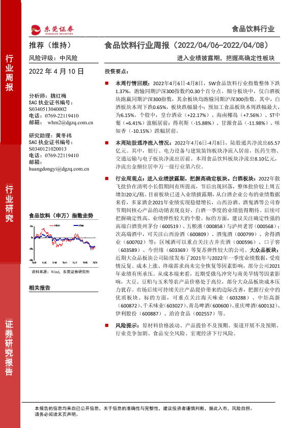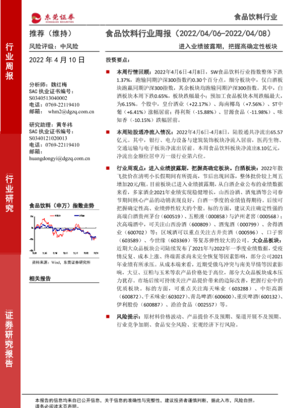 【东莞证券】【20220410】20220410-东莞证券-食品饮料行业周报:进入业绩披露期,把握高确定性板块-13页