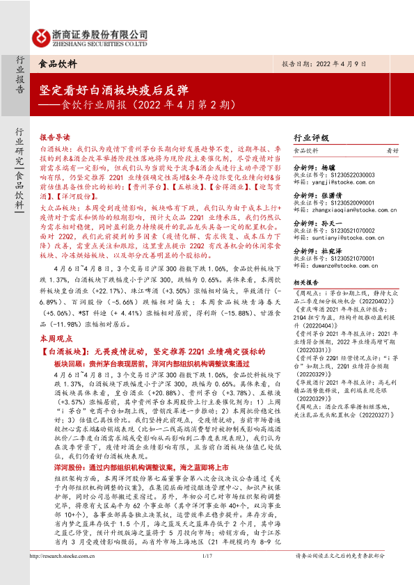 【浙商证券】【20220409】食饮行业周报(2022年4月第2期):坚定看好白酒板块疫后反弹-17页