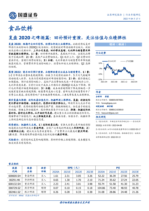 【国盛证券】【20220417】食品饮料复盘2020之啤酒篇:回补预计重演,关注估值与业绩弹性-11页