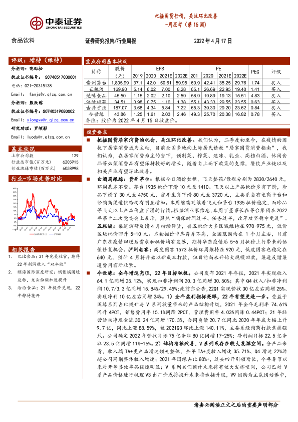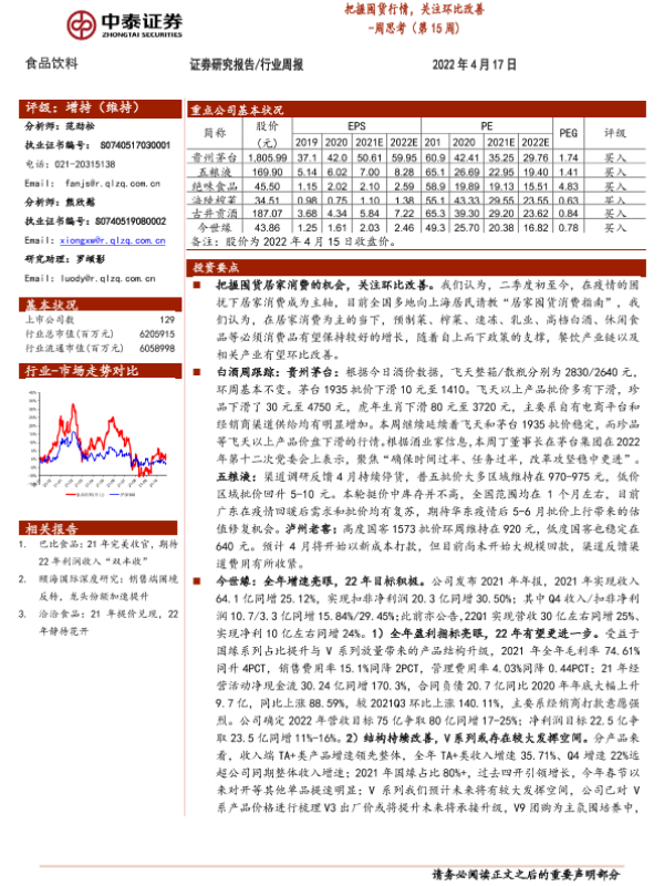 【中泰证券】【20220417】20220417-中泰证券-食品饮料周思考(第15周):把握囤货行情,关注环比改善-13页