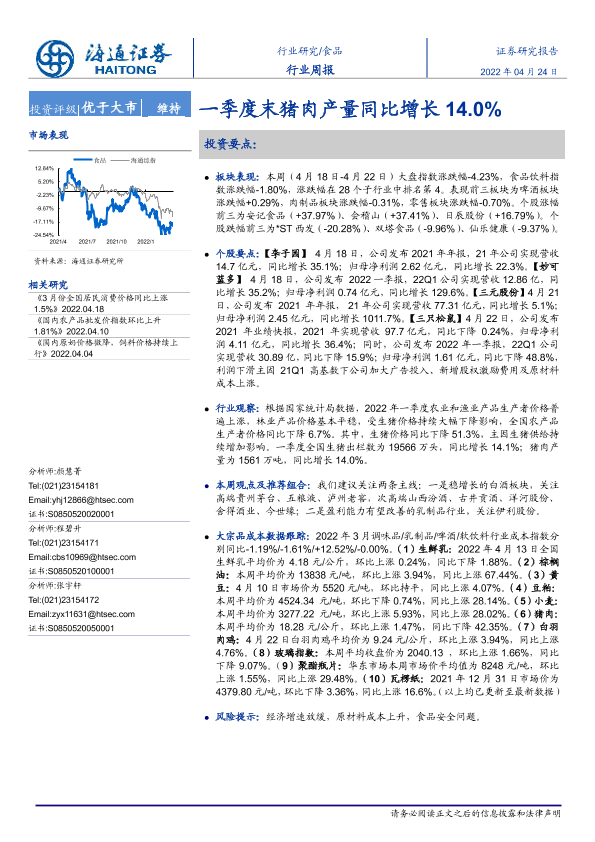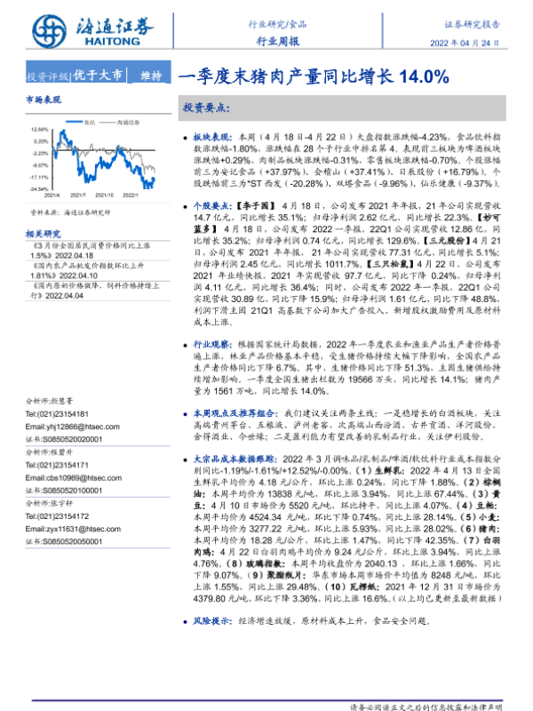 【海通证券】【20220424】20220424-海通证券-食品行业周报:一季度末猪肉产量同比增长14.0%-10页
