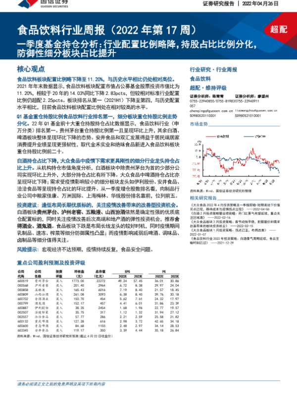 【国信证券】【20220426】食品饮料行业周报(2022年第17周):一季度基金持仓分析:行业配置比例略降,持股占比比例分化,防御性细分板块占比提升-11页