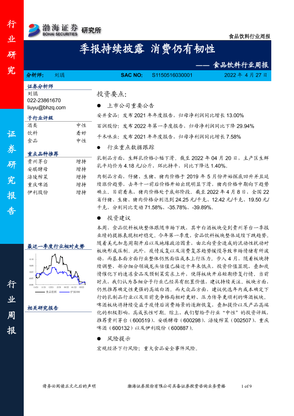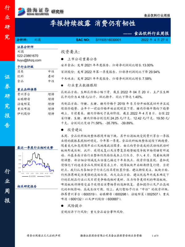 【渤海证券】【20220427】食品饮料行业周报:季报持续披露 消费仍有韧性-9页