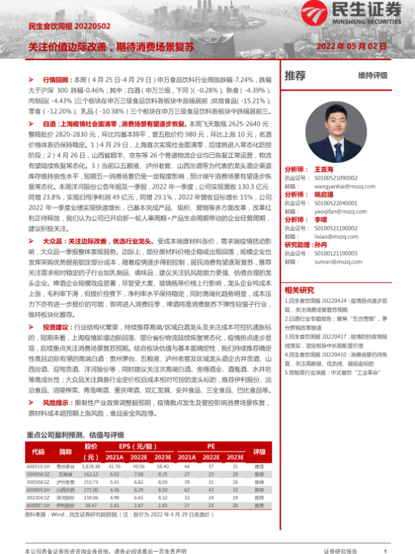 【民生证券】【20220502】民生食饮周报:关注价值边际改善,期待消费场景复苏-11页