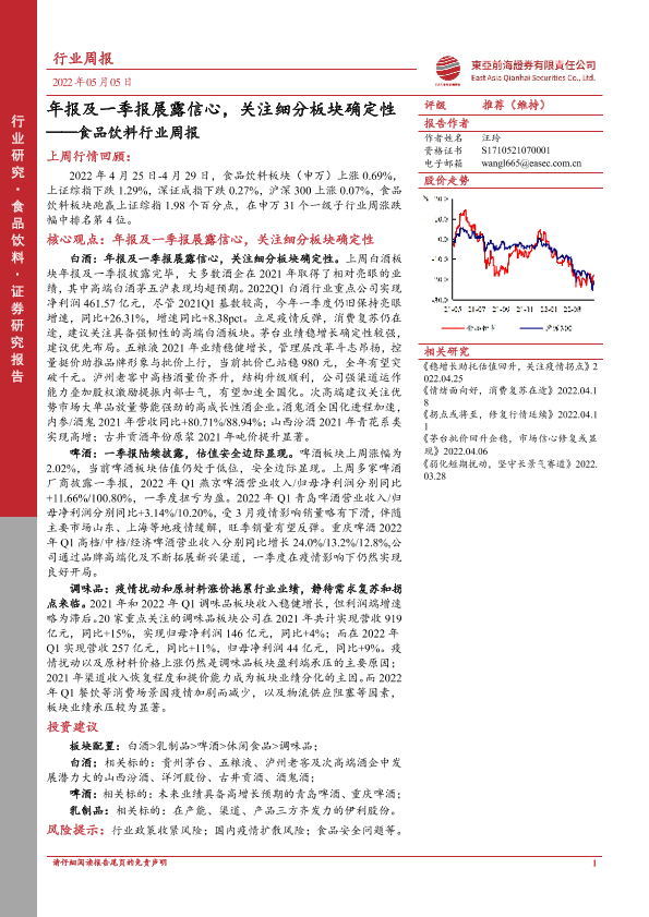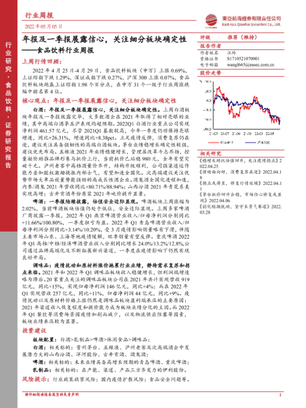 【东亚前海证券】【20220505】20220505-东亚前海证券-食品饮料行业周报:年报及一季报展露信心,关注细分板块确定性-18页