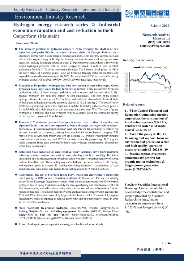 【东吴证券(香港)】【20220608】环保行业深度:氢能系列研究二,产业链经济性测算与降本展望-46页