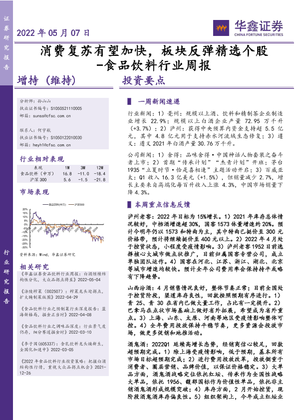 【华鑫证券】【20220507】20220507-华鑫证券-食品饮料行业周报:消费复苏有望加快,板块反弹精选个股-18页