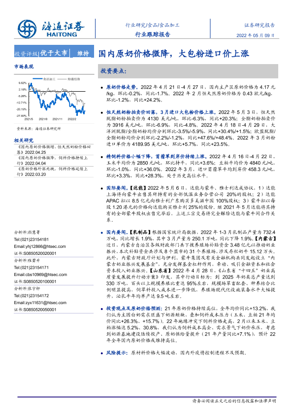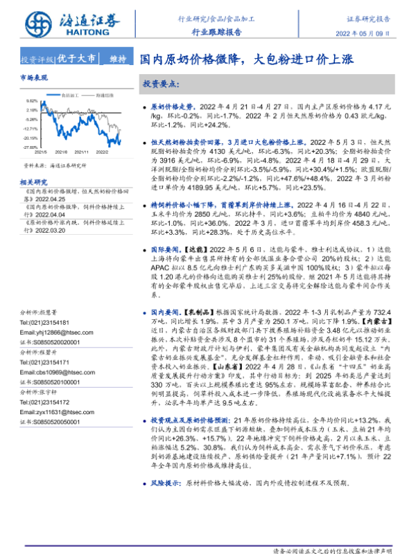 【海通证券】【20220509】20220509-海通证券-食品加工行业跟踪报告:国内原奶价格微降,大包粉进口价上涨-10页