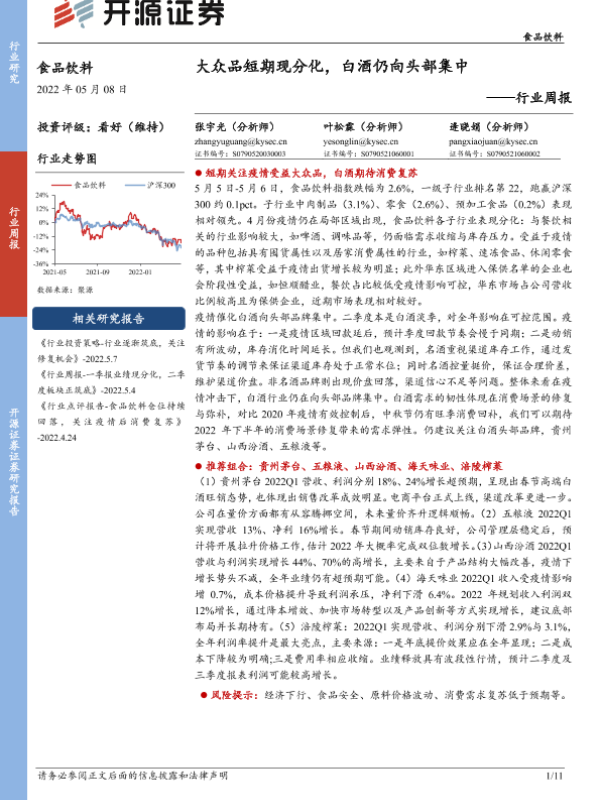 【开源证券】【20220508】食品饮料行业周报:大众品短期现分化,白酒仍向头部集中-11页