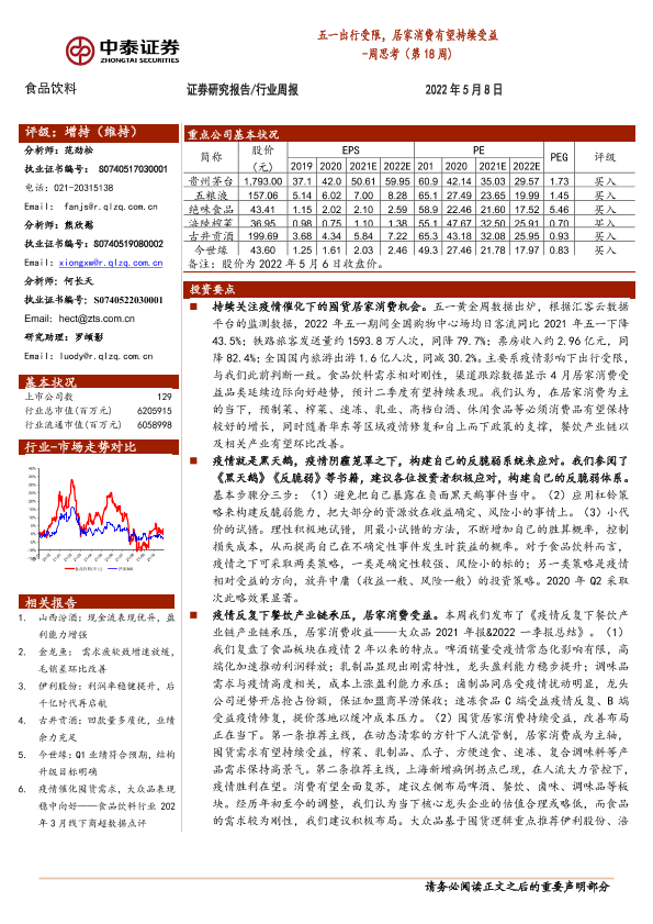 【中泰证券】【20220508】五一出行受限,居家消费有望持续受益-17页