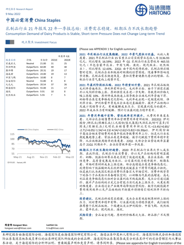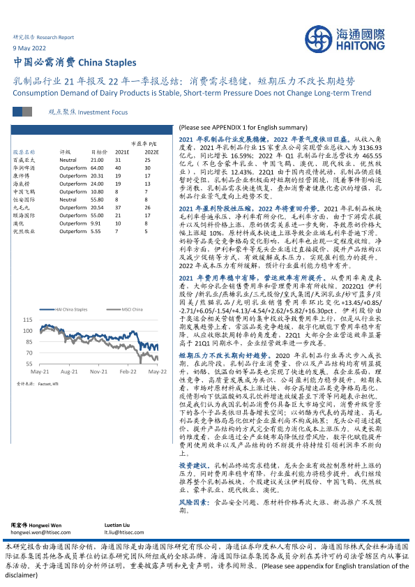【海通国际】【20220509】乳制品行业21年报及22年一季报总结:消费需求稳健,短期压力不改长期趋势-15页