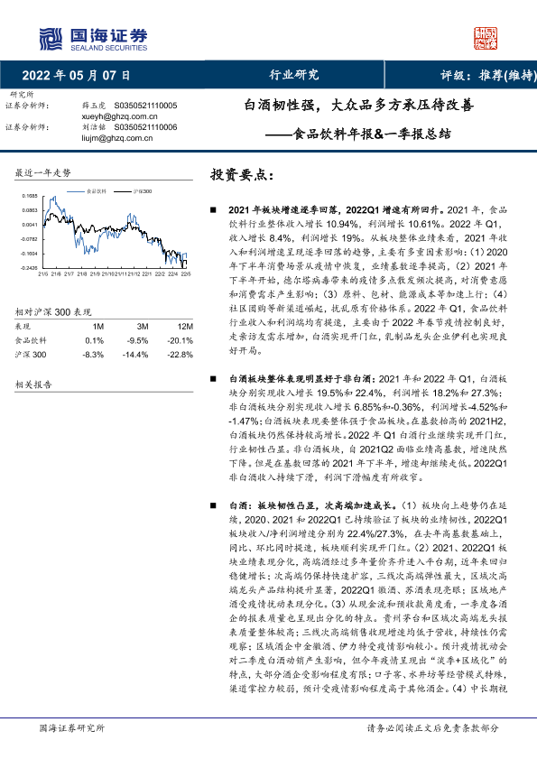 【国海证券】【20220507】20220507-国海证券-食品饮料年报&一季报总结:白酒韧性强,大众品多方承压待改善-43页