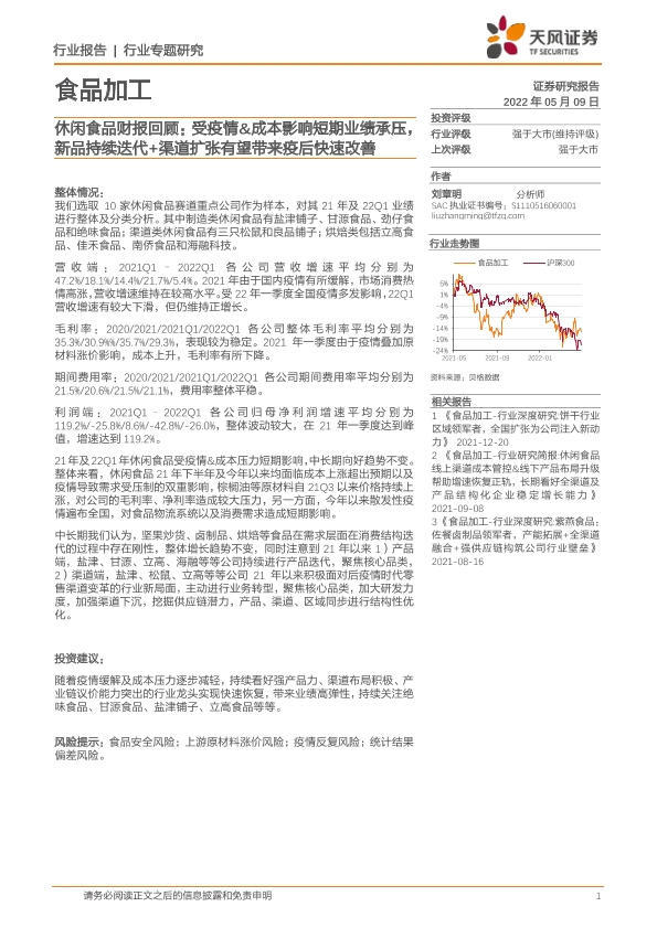 【天风证券】【20220509】20220509-天风证券-休闲食品财报回顾:受疫情&成本影响短期业绩承压,新品持续迭代+渠道扩张有望带来疫后快速改善-10页