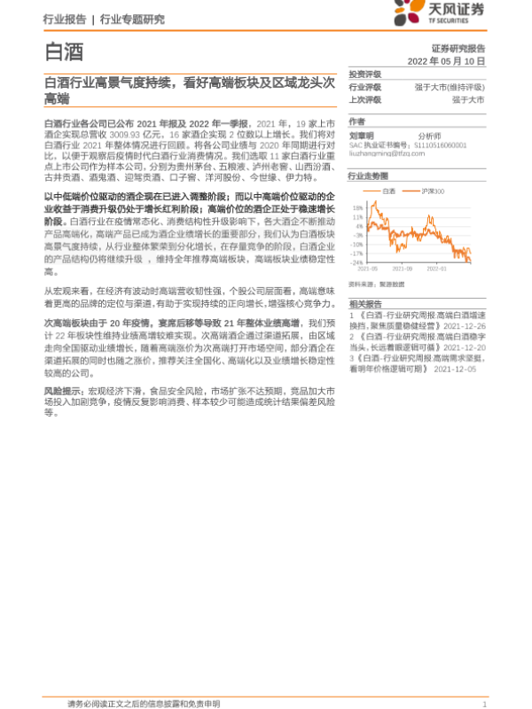 【天风证券】【20220510】白酒行业高景气度持续,看好高端板块及区域龙头次高端-16页