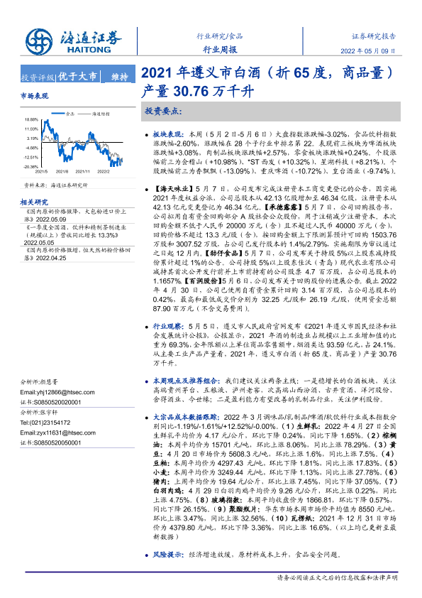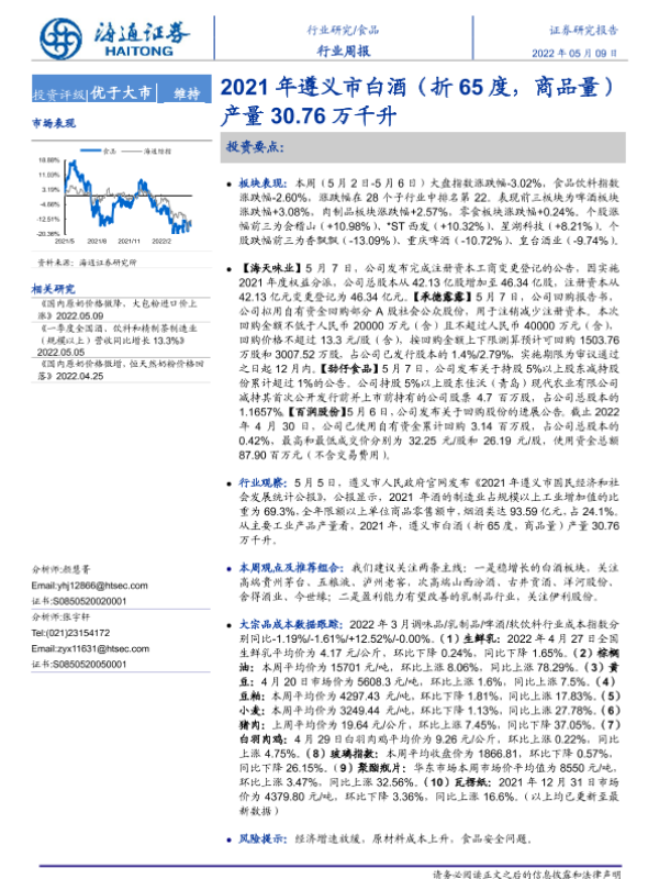 【海通证券】【20220509】20220509-海通证券-食品行业周报:2021年遵义市白酒(折65度,商品量)产量30.76万千升-10页