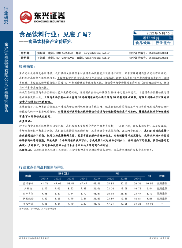 【东兴证券】【20220516】食品饮料资产定价研究:食品饮料行业:见底了吗?-16页