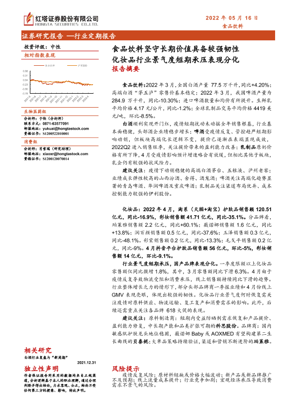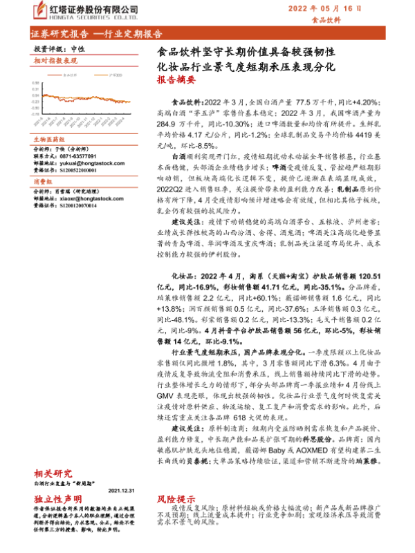 【红塔证券】【20220516】食品饮料坚守长期价值具备较强韧性 化妆品行业景气度短期承压表现分化-13页
