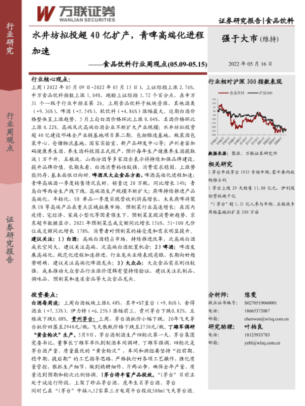 【万联证券】【20220516】20220516-万联证券-食品饮料行业周观点:水井坊拟投超40亿扩产,青啤高端化进程加速-12页