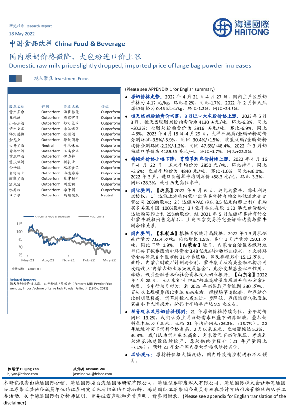 【海通国际】【20220518】中国食品饮料:国内原奶价格微降,大包粉进口价上涨-14页