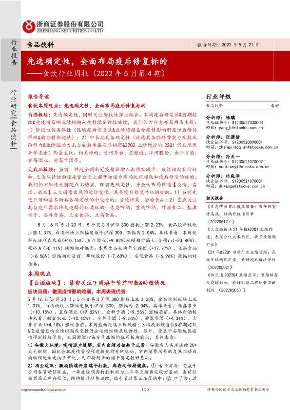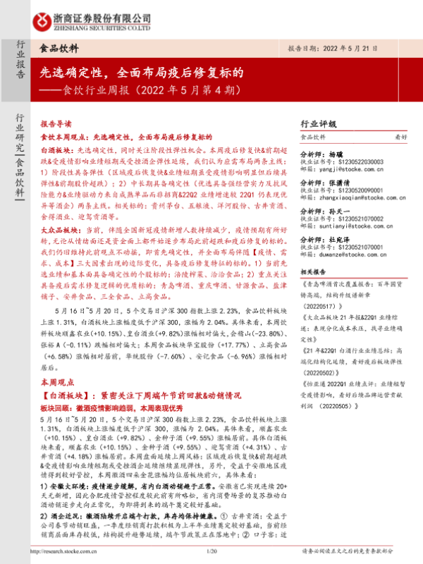 【浙商证券】【20220521】食饮行业周报(2022年5月第4期):先选确定性,全面布局疫后修复标的-20页