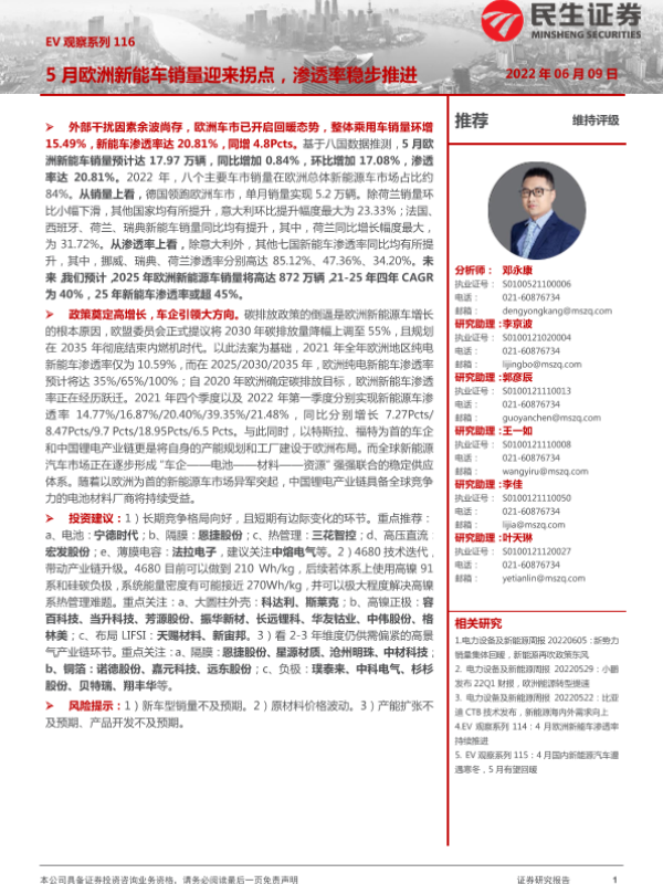 【民生证券】【20220609】电力设备及新能源行业EV观察系列116:5月欧洲新能车销量迎来拐点,渗透率稳步推进-21页