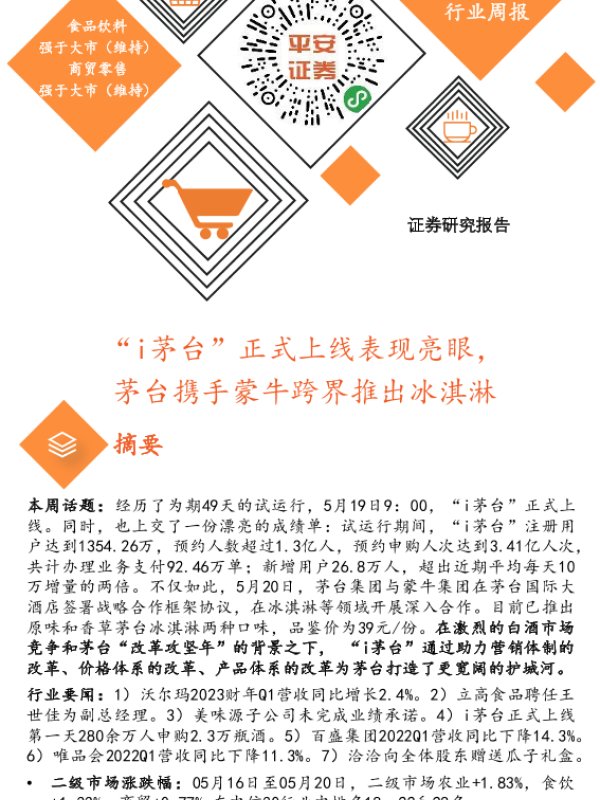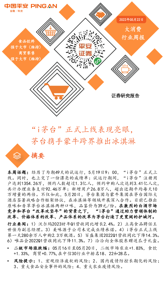 【平安证券】【20220522】20220522-平安证券-大消费行业周报:“i茅台”正式上线表现亮眼,茅台携手蒙牛跨界推出冰淇淋-8页