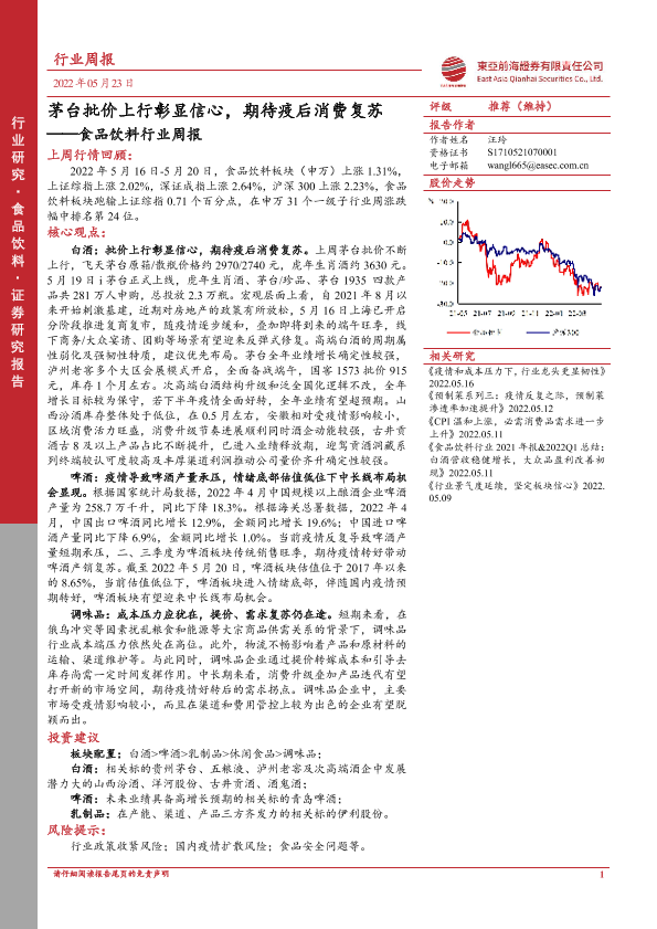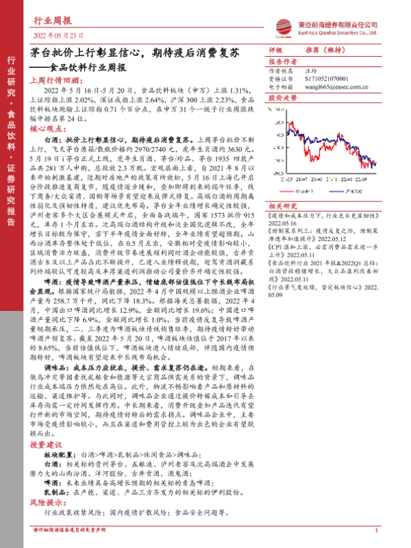 【东亚前海证券】【20220523】20220523-东亚前海证券-食品饮料行业周报:茅台批价上行彰显信心,期待疫后消费复苏-16页