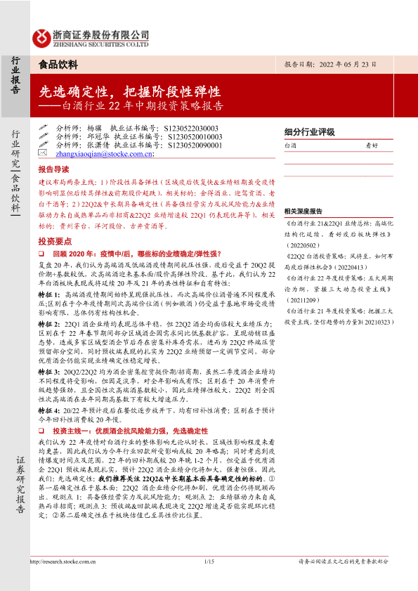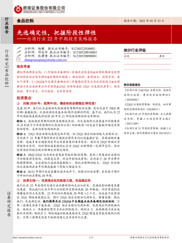 【浙商证券】【20220523】20220523-浙商证券-白酒行业22年中期投资策略报告:先选确定性,把握阶段性弹性-15页