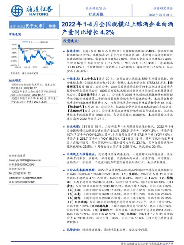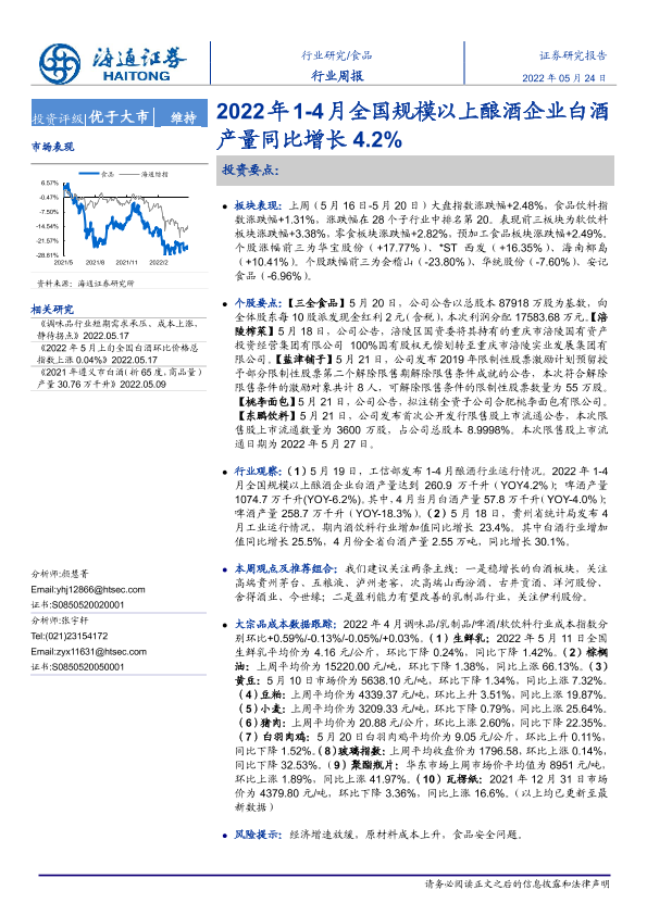 市场表现 成本数据 投资评级 白酒产量 食品行业