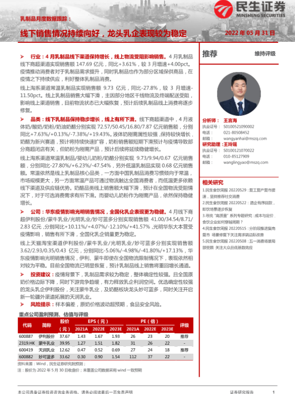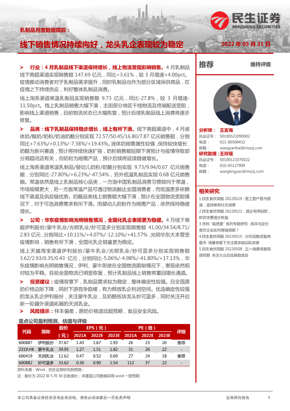 【民生证券】【20220531】20220531-民生证券-乳制品月度数据跟踪:线下销售情况持续向好,龙头乳企表现较为稳定-10页